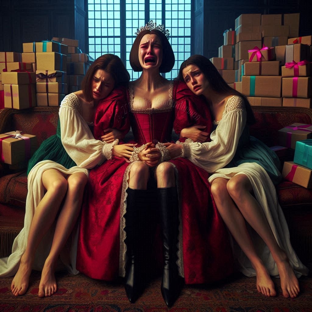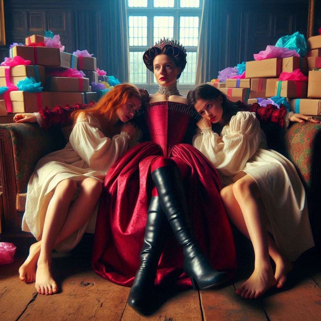 “Whatever you have or have not been to one another, you’re sister-wives now—my sisterwives—and you will need to work and play as a team to please me.  Practice makes perfect, and this is your chance to practice in security and safety.  It will be just the three of us, for seven days and nights.  As a Queen, my duties cannot be ignored for a week so I will have to hold Court and meet with my nobles and ministers each day, while you attend to me and take care of the chores.  We will be alone, which means no servants.  Sindonie has raised you properly, to remember your place is in service to me, and therefore, you now know, in service to my Court, and not to expect human servants dedicated to you, whatever the roles we play here at Fensmere Manor in front of outsiders.  In addition to being a chance to spend quality time together and define our own relationship, it will be a chance to test yourselves and show me your joy in service of me, just as I take pleasure in serving the Realm.  As always, you serve the Realm by serving me.