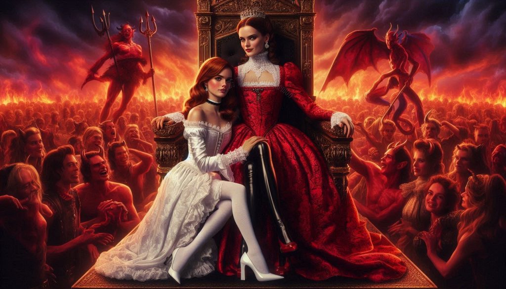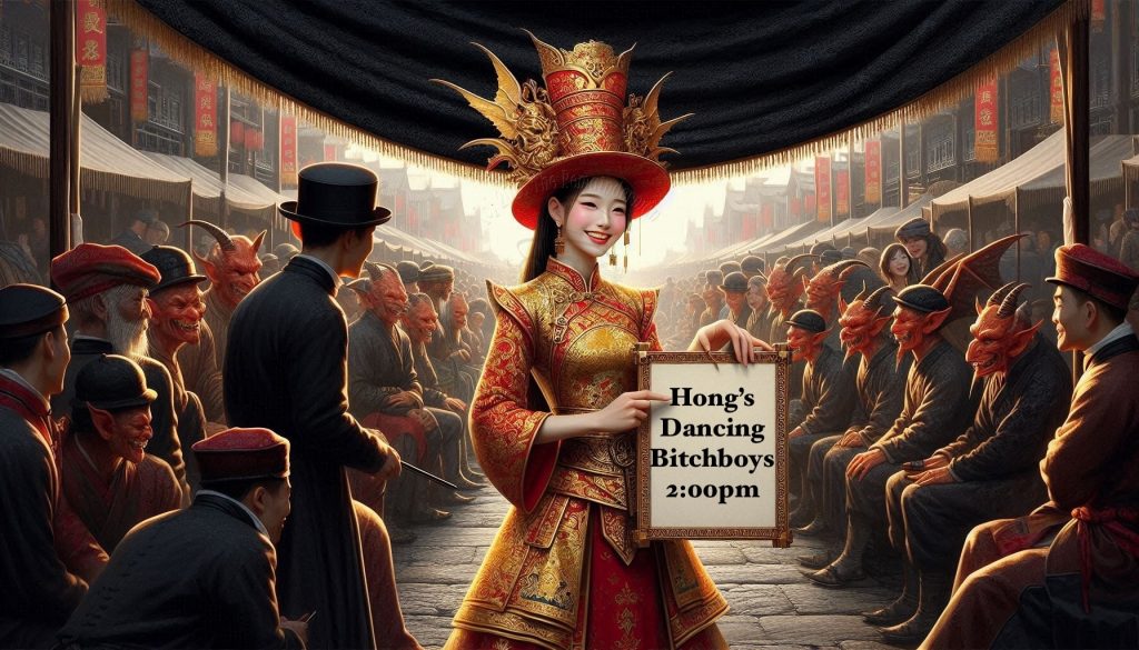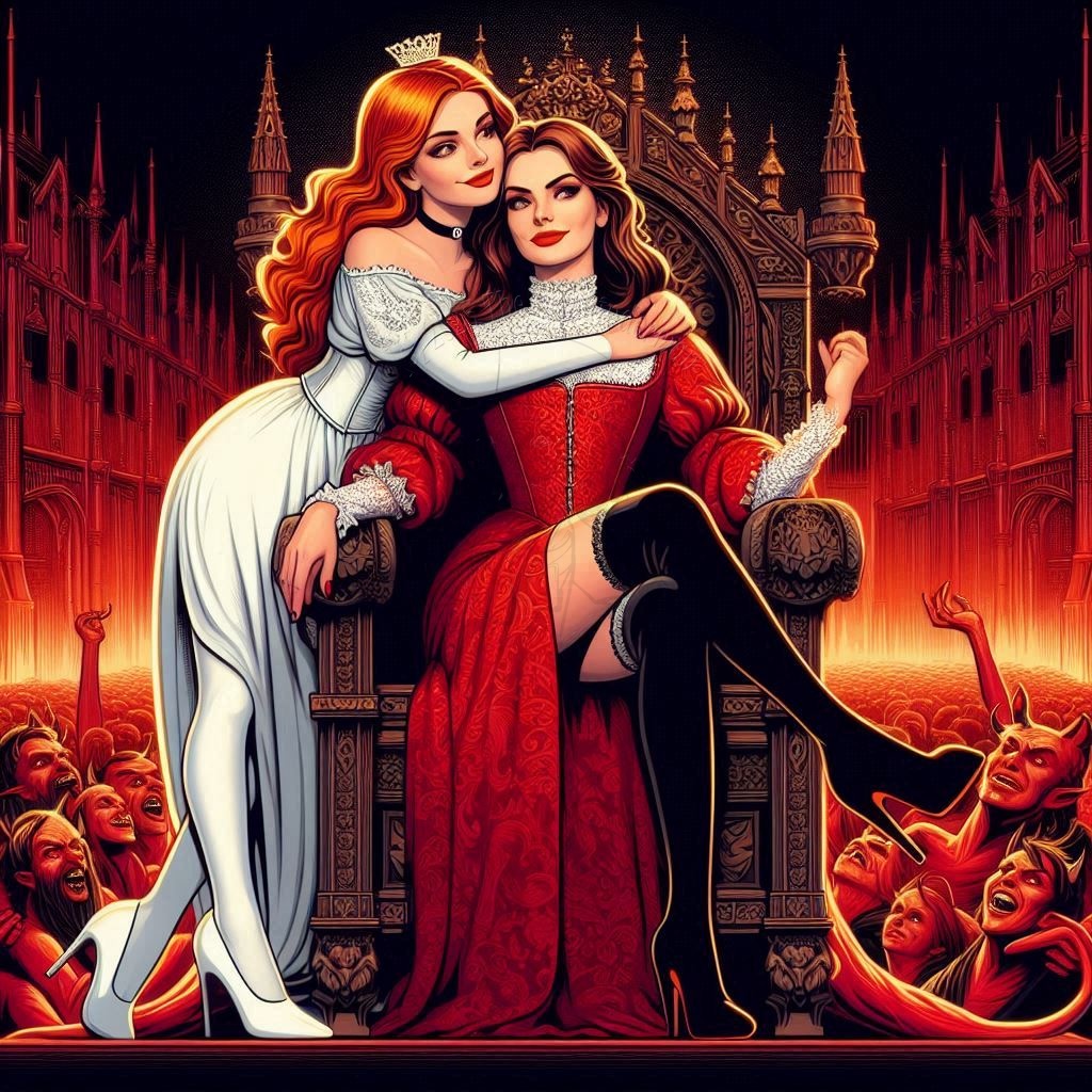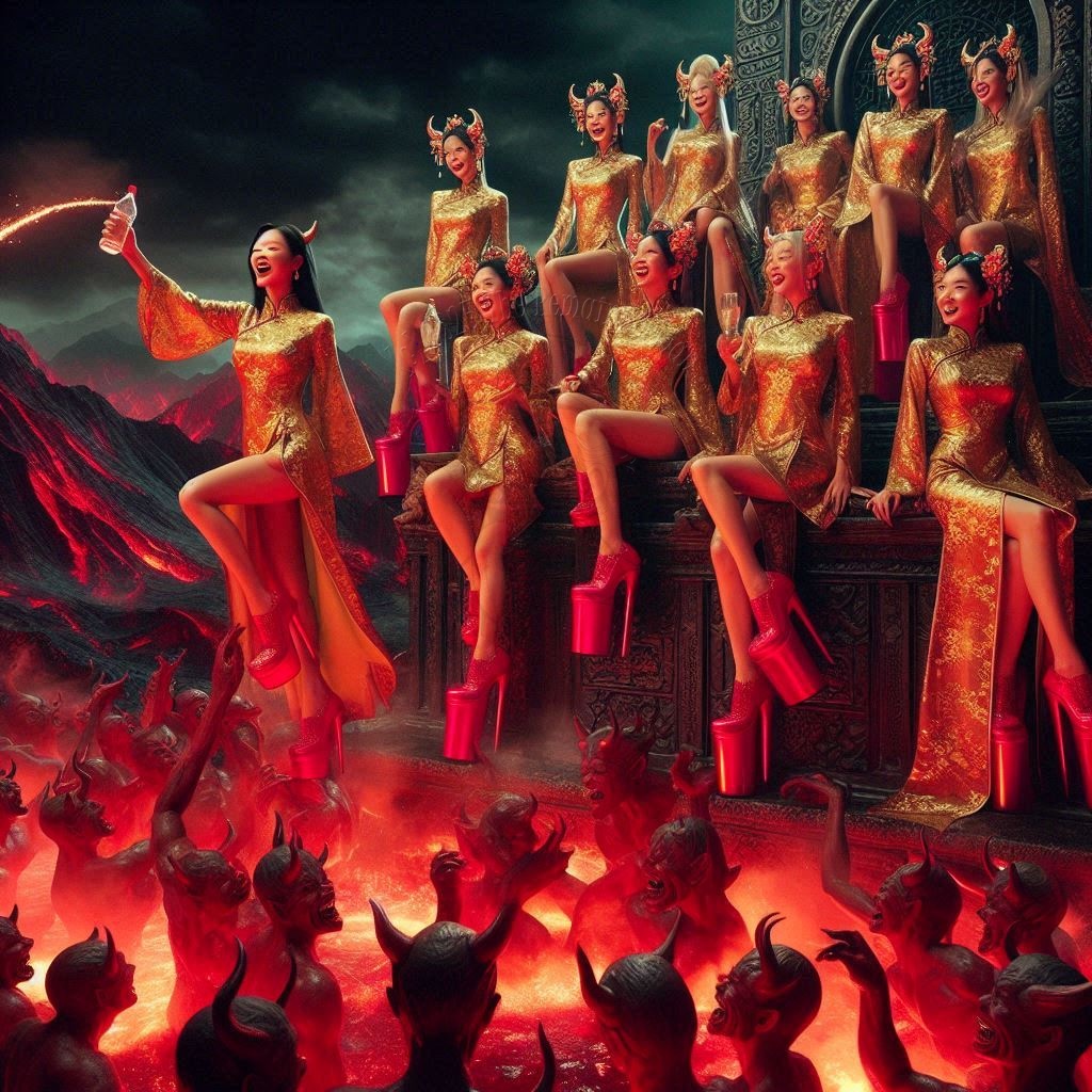 Hong laughed gaily.  “Please!  We’re qahramanat—madames, circus lion-tamers, dominatrices, whatever you want to call us.  We may be part of the entertainment, but we’re not the ones putting out.  The jawari are the whores.  Remember, the purpose of whores—pornoi—is to serve men’s lust.  On Earth, that is physical, and women can do it despite their indifference.  In Hell, it is spiritual:  the devils—all, or virtually all, male at the castles of huskers like Channah and Fang—are reacting not to our female bodies, but to the amount of lust—that’s their desire, not their satisfaction—that we can wring out of our poor little boybitches.  We magnify the devils’ agony by magnifying the lust they can sense but never slake.”