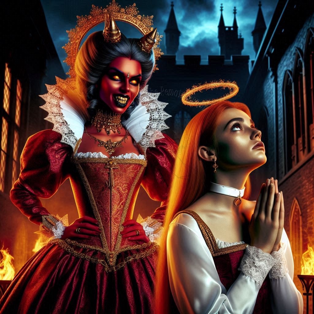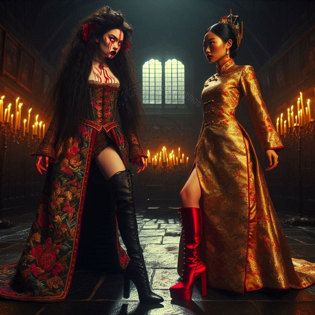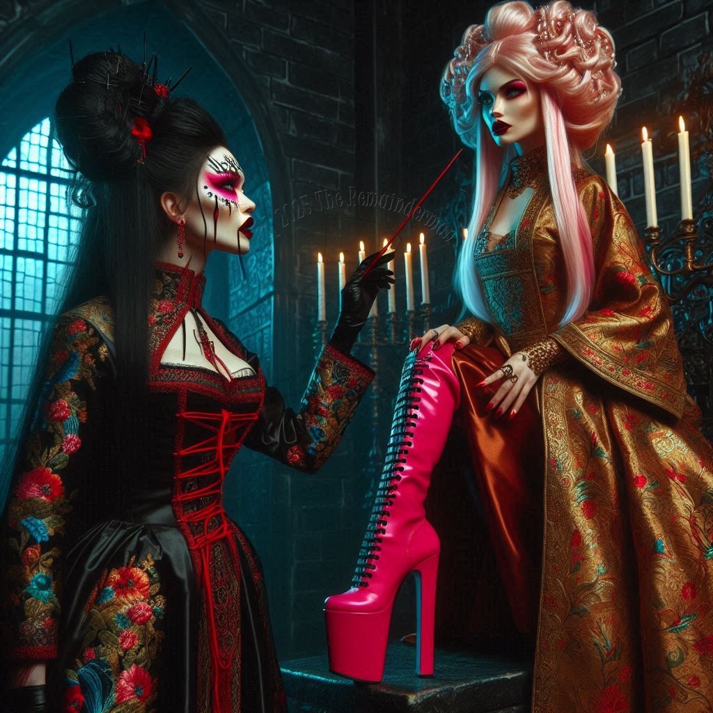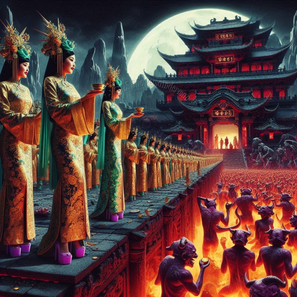 Hong laughed gaily.  “Please!  We’re qahramanat—madames, circus lion-tamers, dominatrices, whatever you want to call us.  We may be part of the entertainment, but we’re not the ones putting out.  The jawari are the whores.  Remember, the purpose of whores—pornoi—is to serve men’s lust.  On Earth, that is physical, and women can do it despite their indifference.  In Hell, it is spiritual:  the devils—all, or virtually all, male at the castles of huskers like Channah and Fang—are reacting not to our female bodies, but to the amount of lust—that’s their desire, not their satisfaction—that we can wring out of our poor little boybitches.  We magnify the devils’ agony by magnifying the lust they can sense but never slake.”