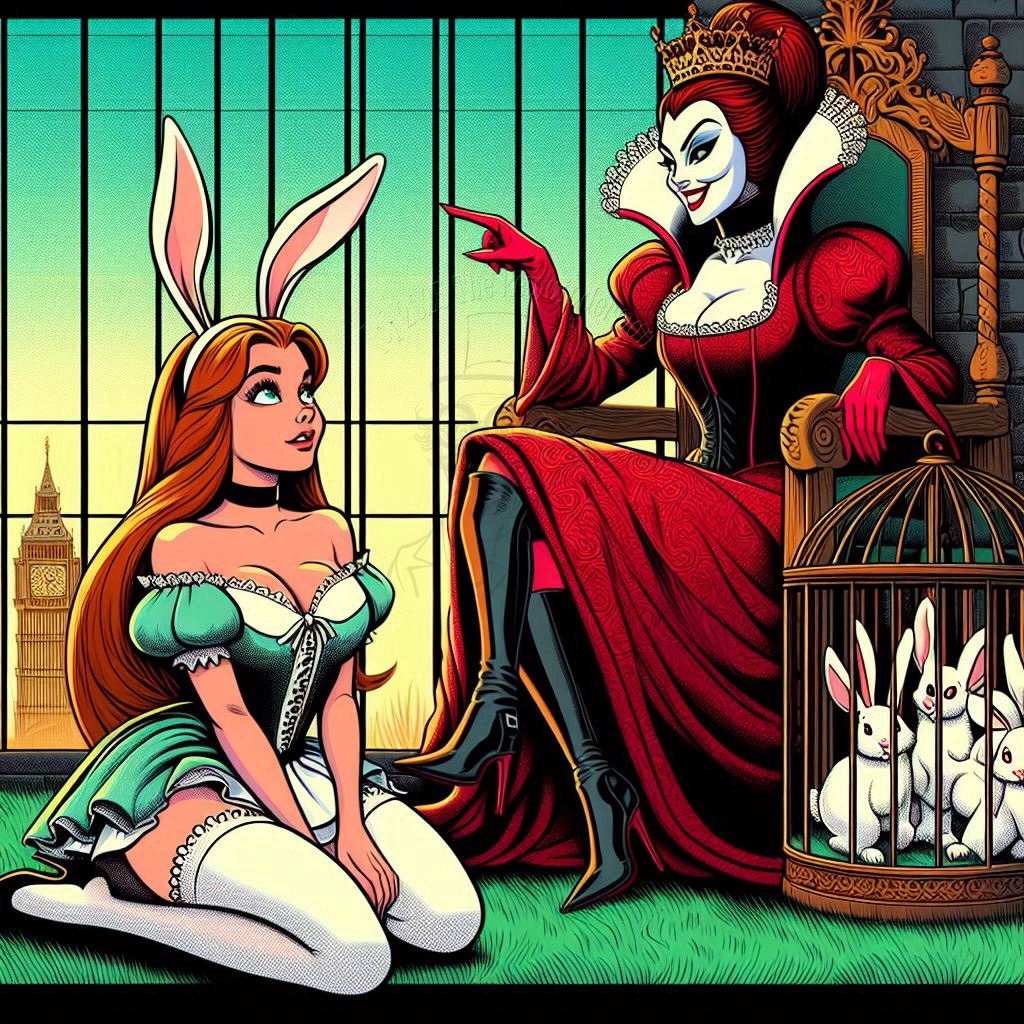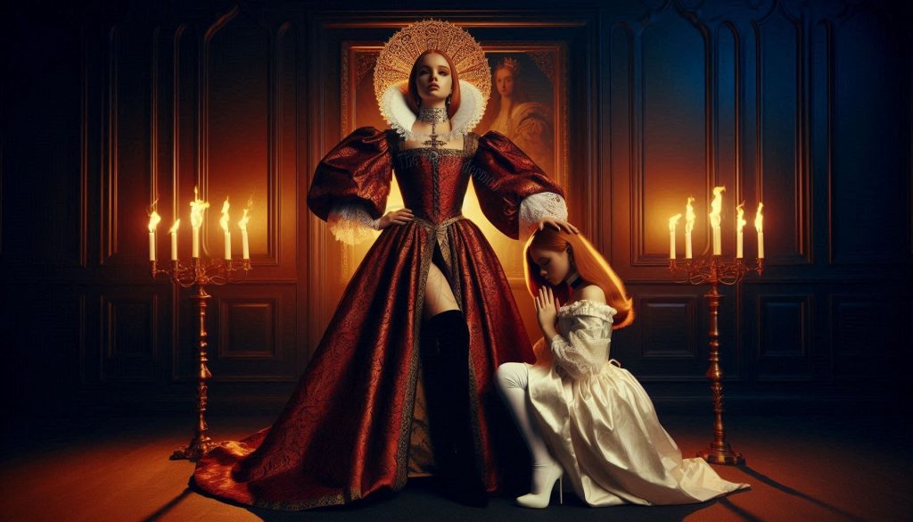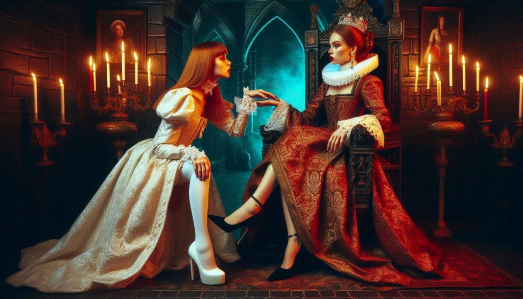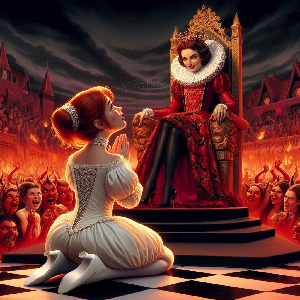 “And keep begging!  More explicitly!  I want details!  Tell—me—exactly—what—you—want, bitch!”  Channah commanded, calm but emphatic and authoritative, as she stepped off Penny’s chest and then slowly, tauntingly, both of them knowing what she was doing, shuffling backwards over Penny’s legs, raising her skirt so Penny, afraid and appalled, but helplessly aroused to be so submissive, locked her mesmerized, horrified, bulging, lovestruck eyes on the evolution occurring there without even erasing her womanhood.  Channah paused, standing over Penny’s hips, trapping Penny’s feet under her knees.  “Until I tell you to stop, footstool!”  She dripped her contempt down on her girl, watching her slowly start to move her body, unconscious of what was happening, as she—the natural submissive inside her—started responding, more and more deeply, to Channah’s dominance.  Her hips were moving.  Her legs were still raised, helplessly and openly, like those of a chicken or turkey ready to be ripped apart and eaten by hungry diners around a dinner table.  They slowly waved, obscenely, as her hips moved, her hands still working on her chest, her shoulders rolling and her head shaking as if she couldn’t even believe her own lack of dignity and morality.  Her whole body was bobbing in time to her heart.  She was panting and grunting as she worked herself into a frenzy for her increasingly cruel and mean-spirited master: