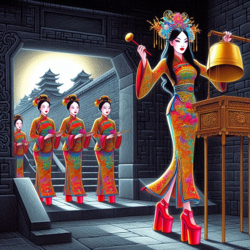 Fang crouched over the effectively-mummified Penny, with her hands steady on Penny’s ajna, the third eye in her head, and muladhara, the basic center of trust in her root—or as close to them as her hands could be.  Channah and one of Hong’s girls knelt on the restrained Chastity.  Hong and her other three jawari struggled to restrain the still-livid, almost-rabid Esmeray.  Like Penny and Chastity, when she could keep her skirts down, Hong almost appeared to be fully-dressed, if sweaty and disheveled with a whore’s slightly smudged makeup.  Unlike them in one respect, the plunging neckline of her cheongsam had already been ripped open, revealing the inner edges of her breasts in a manner that would have been most fetching if it weren’t for the exigencies of the moment.  Hong’s girls were disheveled, and naked, from head to toe, even their cages discarded on the other side of the platform with nothing to interrupt their shiny sweaty perfect cinnamon skin except the marks Hong had made on them with her fingernails and her stiletto heels.  All of them had been forced to interrupt their own ritual to come running to the aid of their overlords in separating the murderous Esmeray from the rebellious Chastity, while the band played on, in accordance with its standing orders, to doggedly play until they were told to stop no matter what they saw or heard or felt, no matter what happened to them.