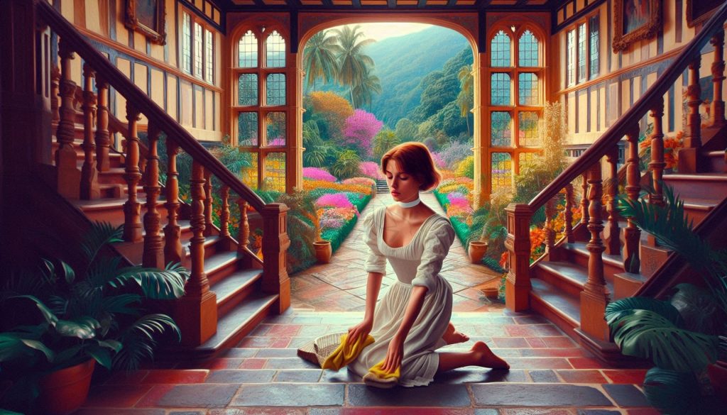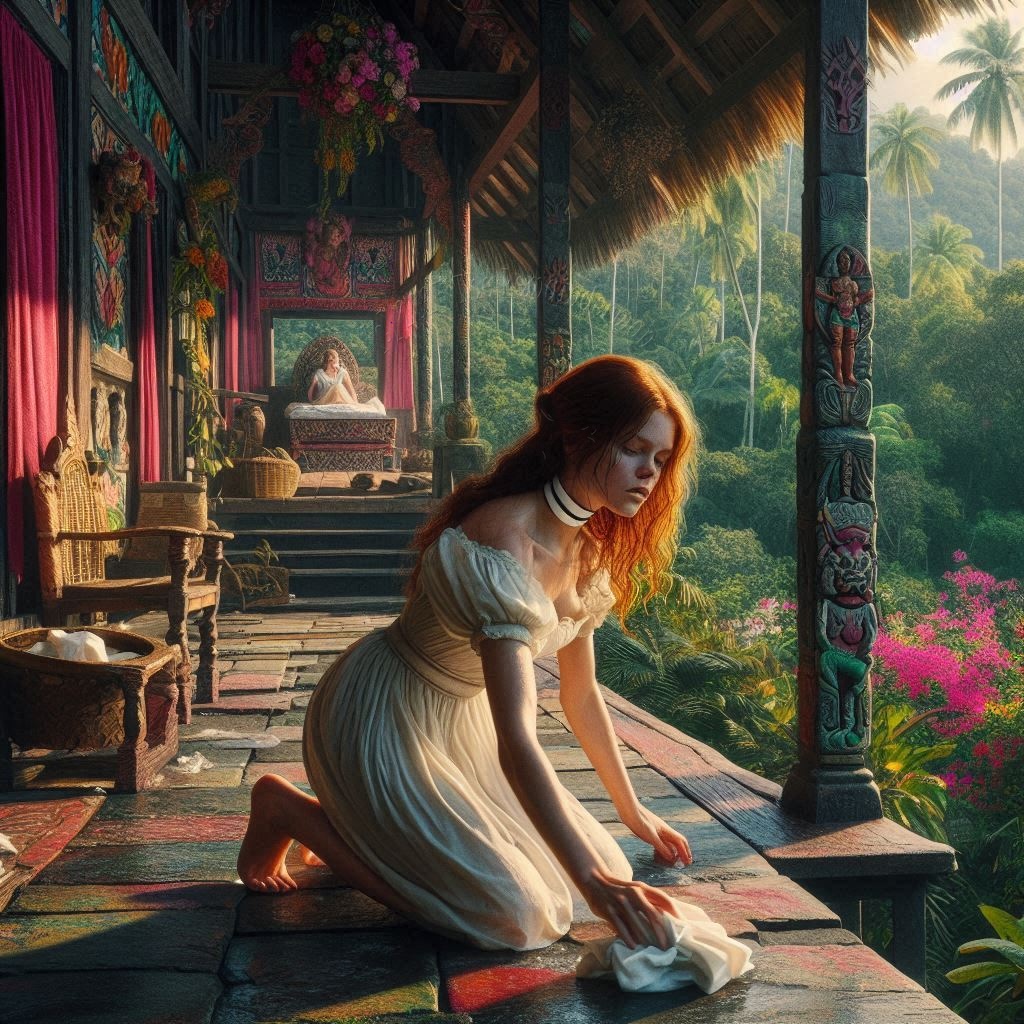 Releasing Penny’s hands and rebinding them before her, and leaving her legs hobbled, simply for the added pleasure of making her work while restrained, she directed Penny to carry the cushions back to the house before the afternoon rains, insulting and shaming her to keep her hustling and hurrying as best she could to keep up with her carefree master.  At the house, she showed Penny where the cushions belonged, and where she could find the cleaning supplies, so she could get working on Channah’s bedroom floor and the stairways and halls they had tracked through from the site of Penny’s big mess until they exited the house.