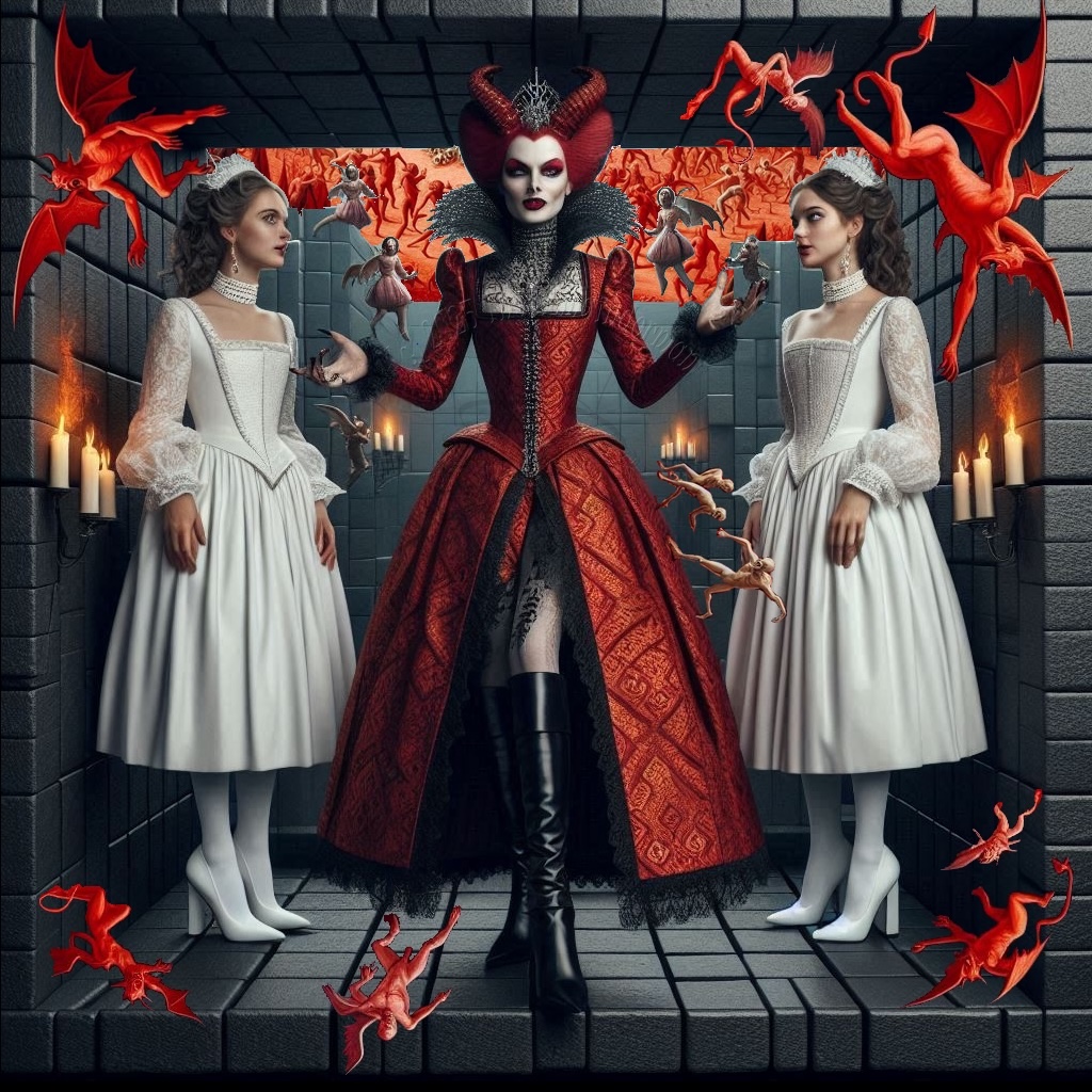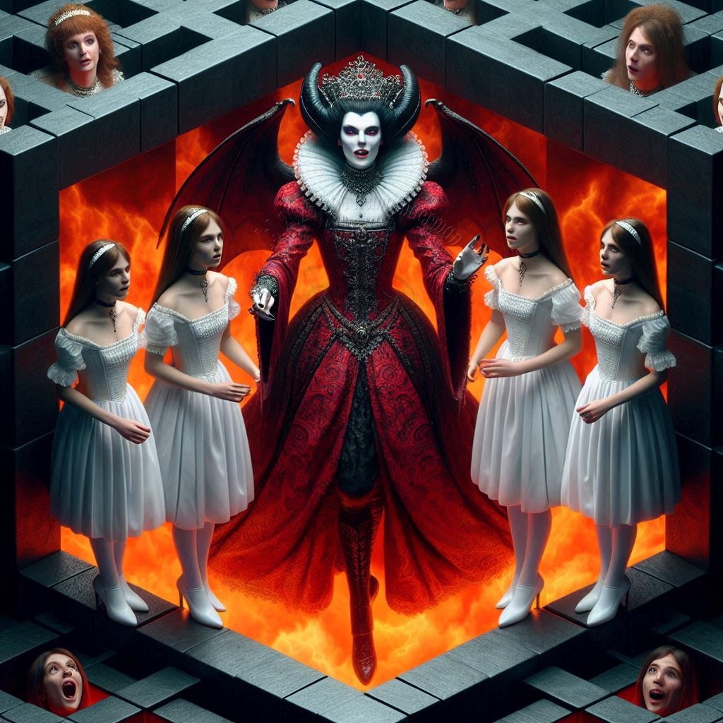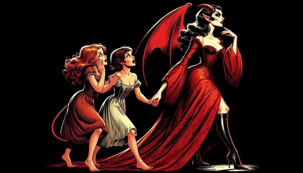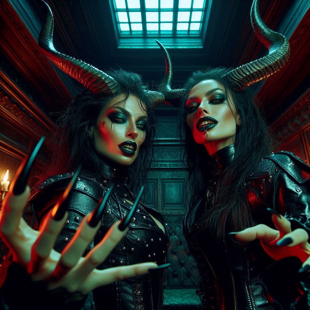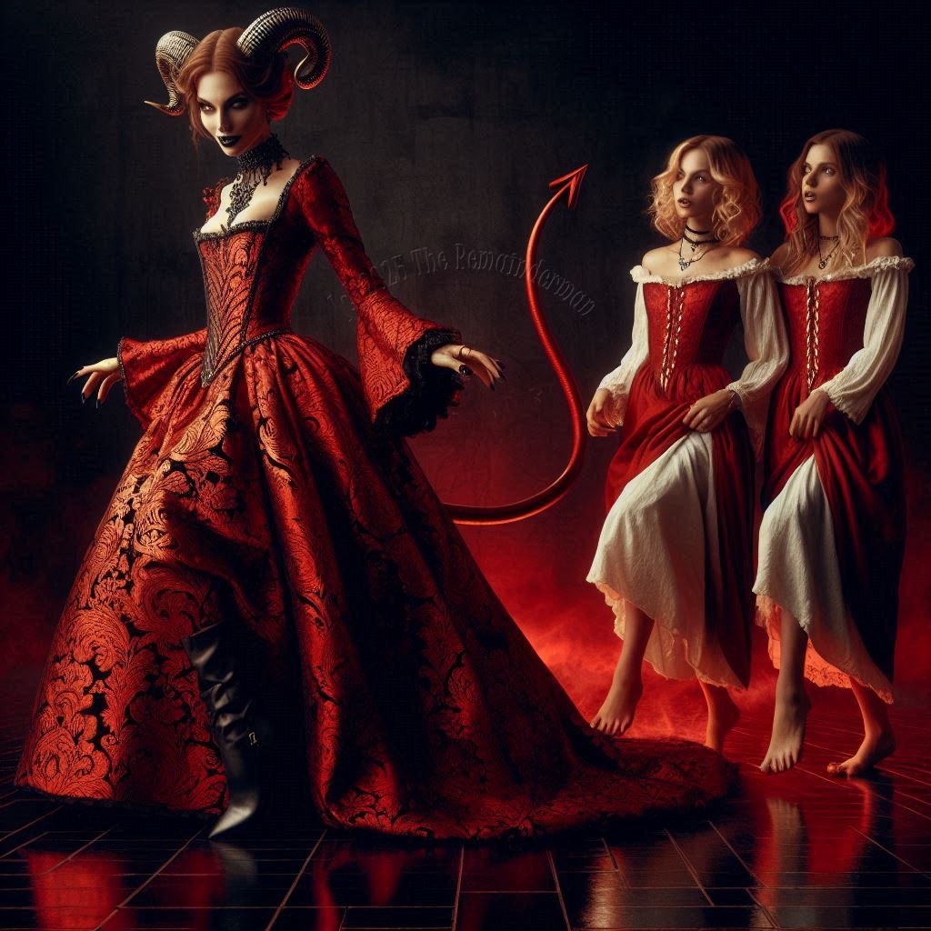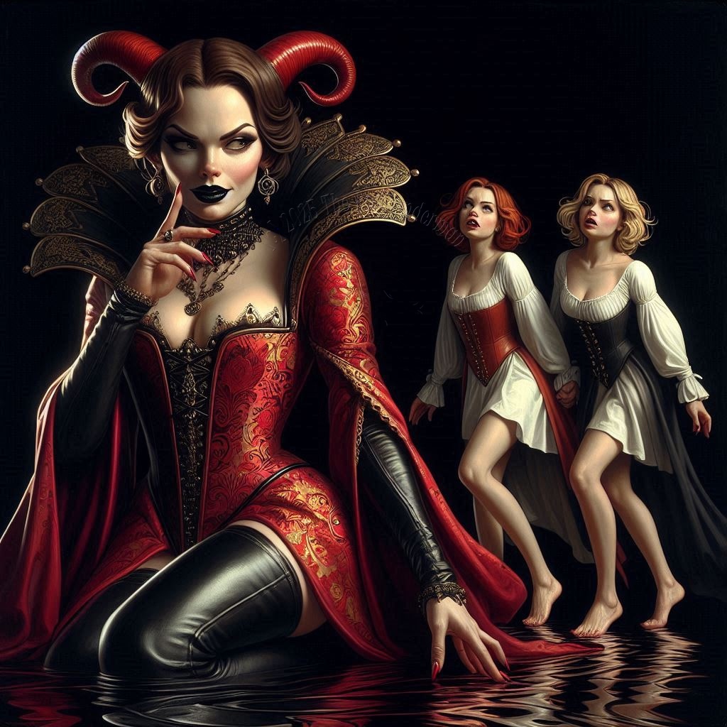 It took him a moment to wrap his mind around what he was seeing, the horns rising from their foreheads, their teeth and fingernails sharpening and lengthening, their skin taking on a ruddy hue under the olive one, and even—though he didn’t spot them until later—their tails extending under their skirts to swirl and brush the floor.  But as soon as he did begin to try and make sense of the insensible, to the succubae’s delight, Orseolo started quaking and blithering Catholic incantations:  “Hail Mary, full of grace, The Lord is with thee.  Blessed art th—”