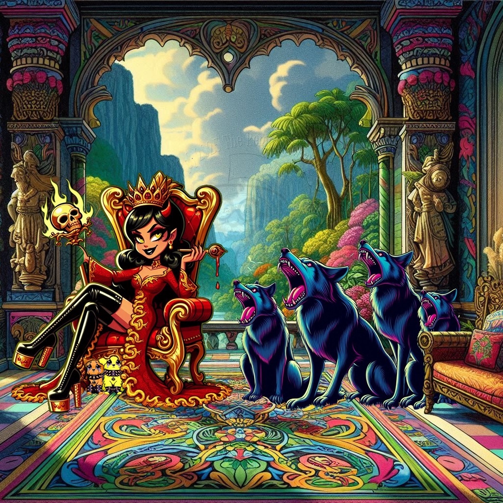 Channah herself sat comfortably on her throne, an ornate gold affair decorated with the same strange figures and motifs, in the same strange style, as the stones of her house and the gold of her bed and her smaller, simpler bedroom throne.  This one, a formal throne of state, sat on a dais rising two feet above the surrounding floor, was flanked with side-tables, was wide as a love seat (allowing her to sit up or lounge to the side as she preferred while conducting her business) and rose in the back to an impressive height—a true throne of command, suitable for the conduct of official business from her mountain retreat.  She was regally clad, in keeping with her throne, in formal robes of state to conduct her business:  a high-necked floor-length scarlet brocade gown embroidered with golden serpents and medlar fruits, a pair of tall shiny black boots, and a tall, viciously spiked crown of gold decorated with rubies.  And she would either be holding, or nestled beside, her onyx scepter, a heavy hexagonal rod topped with a human skull.