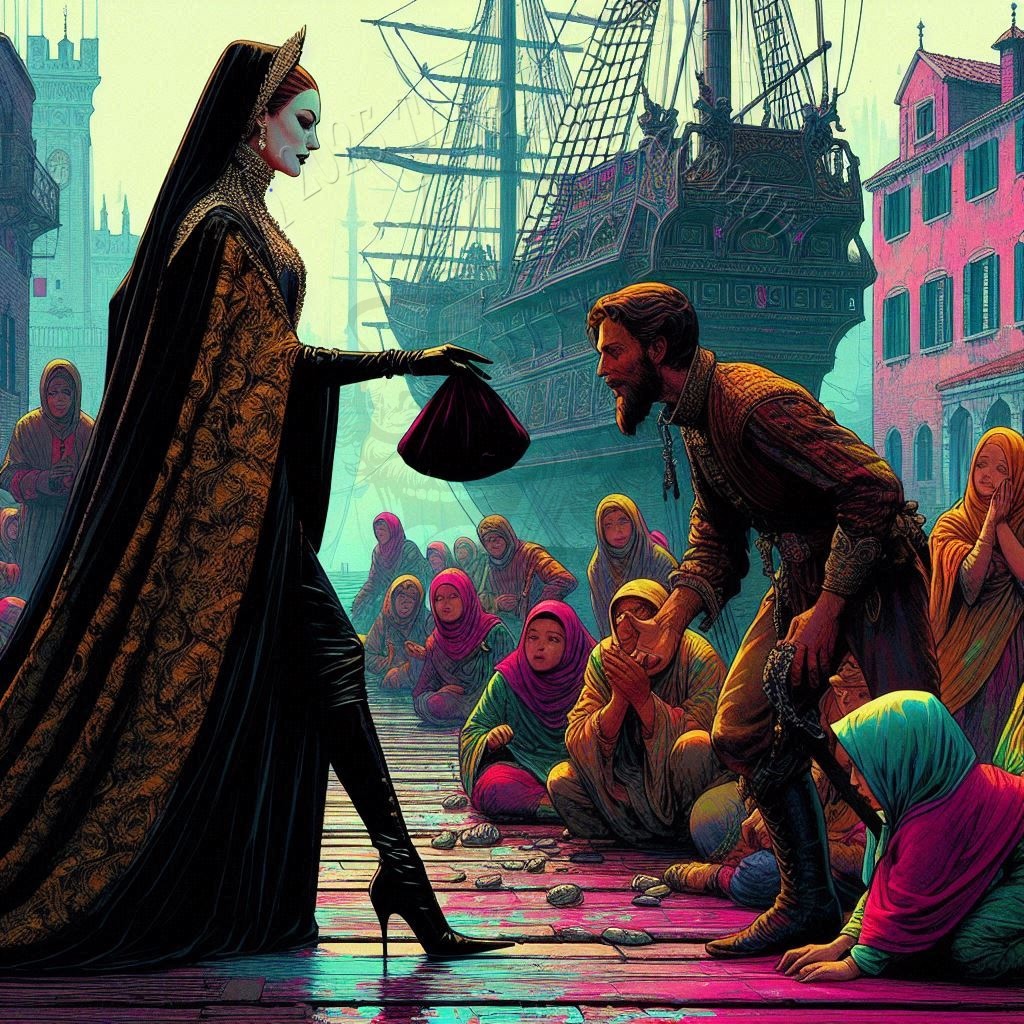 With Channah’s plan thus secured, Rivqah scaled St. Mark’s Basilica and from her vantage point atop it, slew the Venetian guards outside the Doge’s Palace.  Channah and Chava rushed Pen to the Palace and past the guards too quickly for him to examine them or even properly see them, while Channah lied to him that the guards had simply been knocked unconscious; while Miryam dragged their bodies out of sight and, disguised as a Venetian soldier, took their place guarding the half-finished stairway leading to the planned, “new” entrance to the Palace.