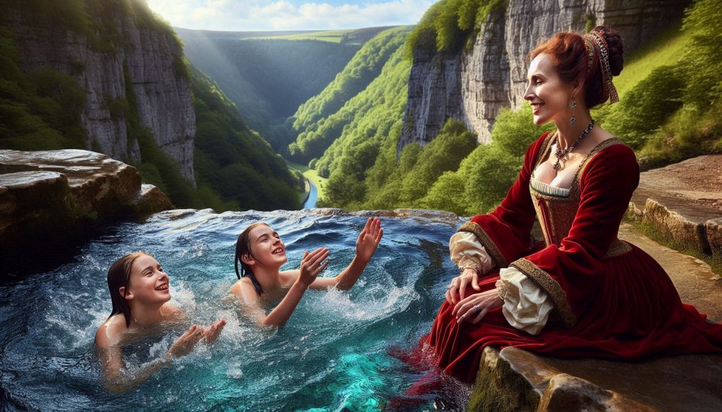 Beyond the hot bath, the forest stream, and the washing-pool was a breathtaking vista, revealed between the high greyish-black cliffs to their left and the forest canopy to their right.  Channah’s vale ended in a low rise of rock, its lowest point the drain and surface level of the bathing pool.  Beyond it were a line of jagged mountain peaks; and, as they got closer, opening out below before the distant peaks, a deep and wide valley thousands of feet below them.
