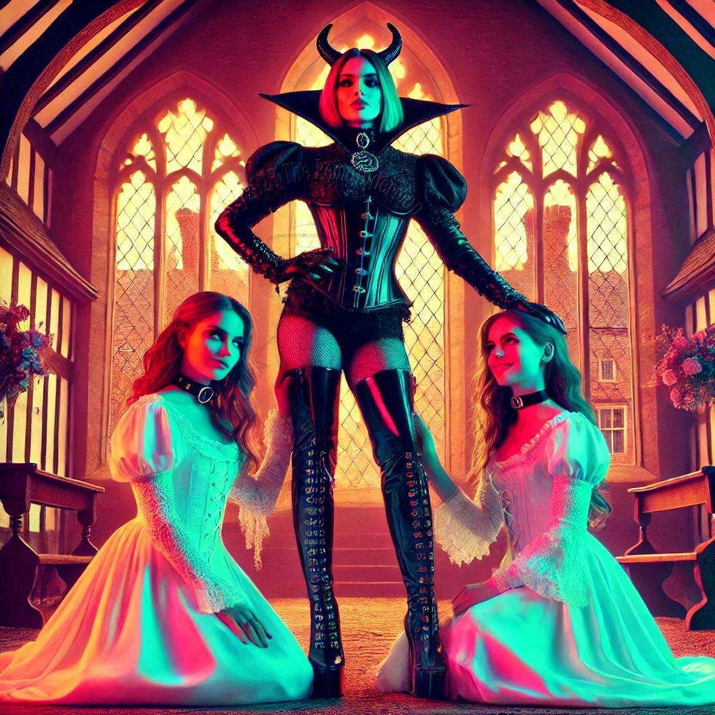 Looking at one another in delighted but nervous surprise, having never seen their own Domina naked before, despite the liberties they had been allowed with her, they knelt.  Smiling magnanimously, she placed her hand on top of Chastity’s head for balance and insolently lifted her foot, presenting her boot to the two girls, who quickly worked it off.  When they stopped, looking up at her expectantly, she raised a questioning eyebrow.  “And my stocking and garter?”