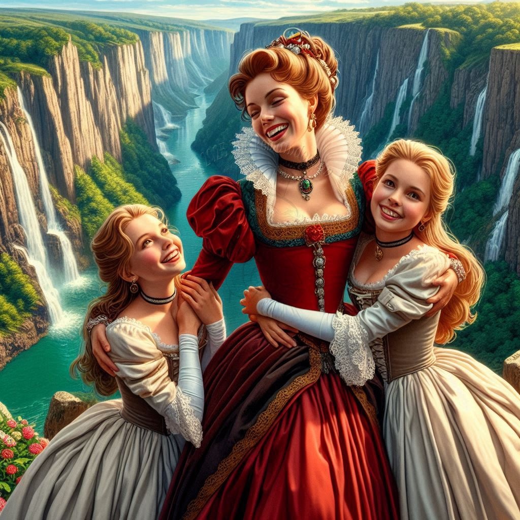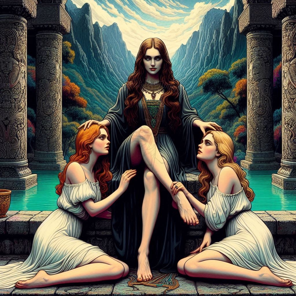 “Remember how everything in the vale looks,” Channah cautioned her girls—as if, they imagined, they could ever forget!  “This, exactly so, is the way I want it.  I gave my gardeners and servants the week off.  Mainly for privacy, so we can enjoy the true, intimate seclusion our marriage entitles us to—something that is among the most difficult things for me, as a Queen, to obtain.  Priceless!  You cannot imagine the constant attention of flatterers and wheedlers, or the freedom of being alone with my loving wives.”  She sighed, squeezing them both as she continued to guide them, past the hot bath and over the stream on a little bridge.  “But partly, I confess, because it turns me on to see my play-partners working and serving me.”  She shivered anticipatorily, leaving them in no doubt how much she meant it.  “It’s almost better than sex, which is saying something for a succubus,” she drawled.  “So expect to spend some time each day cleaning and caring for my paradise.  Obviously,” she shrugged, “You’ll do the cooking and laundry as well,” she purred at the thought, her eyes dancing.  “And I will sit and watch you sweating in the warmth of the afternoon sun.  Oh, yes, you must do the hardest work in the afternoons…” she cooed, running her hands over their shoulders and backs.  “You simply must…” she bit her lip, and shook her head, as if to clear it.