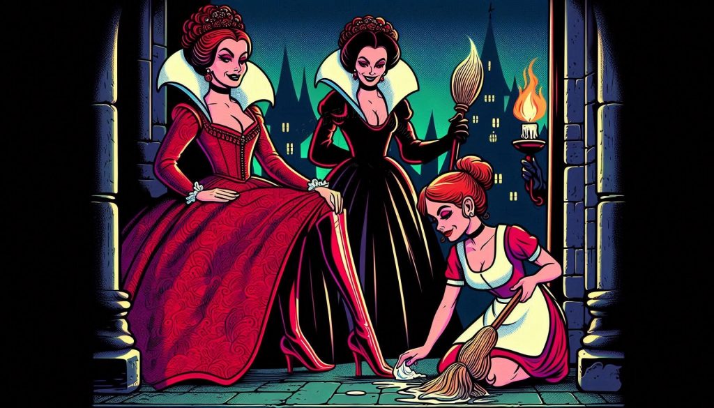 As Chastity scrambled to obey, holding her blistered bottom and whining fussily, hissing when she tried to lie down on her back and felt the pain from her freshly-abused bottom, Húanglóng snapped his fingers to summon his other ceshi: “Penance Batonnoir! Come here this instant!” At the same time, Channah was motioning for Esmeray to come over to her, even as she began pouring wine on her husband’s left foot so it dribbled into Chastity’s mouth as she waited for Esmeray to pick her way across the room.