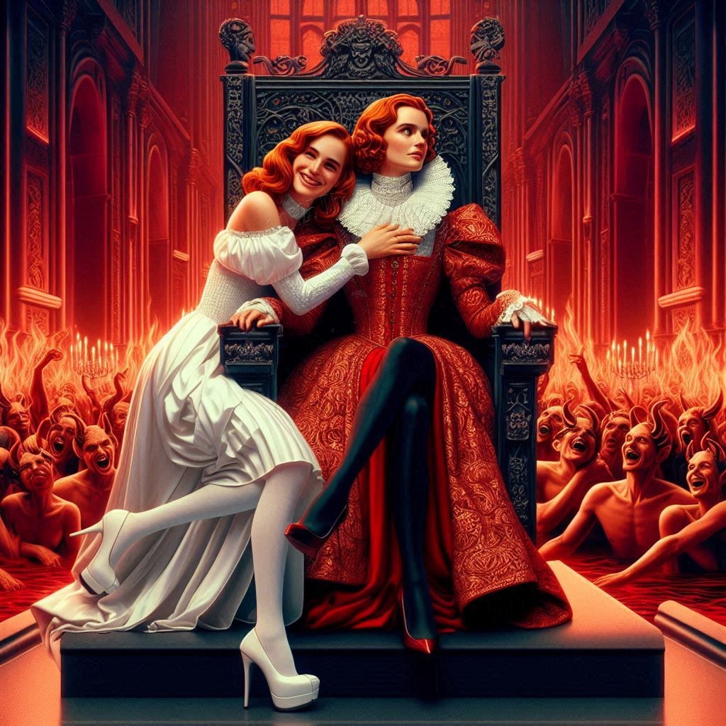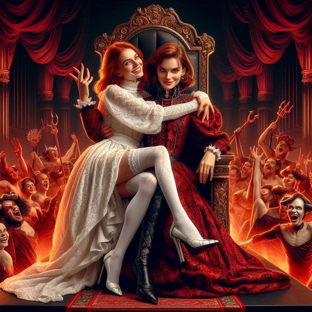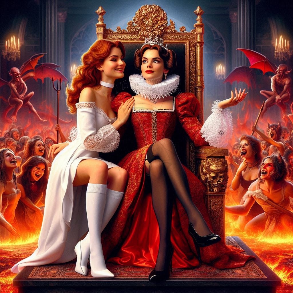 “Your Grace!” Chas repeated automatically, her eyes wide and looking every which way. “I’m sorry, I’m sorry, it’s just—I don’t know—I can’t remember—PENNY!!” she screeched suddenly, taking in her circumstances. Even Penny managed a tiny weak rueful smile as Chastity, continuing to process and taking in Penny’s rearing flesh and desperate face, inferred that she was okay. At least, insofar as any living soul dragged to hell for unnatural supernatural sex-torture rituals and hung out over a precipice above an ocean of ravenous devils could be.