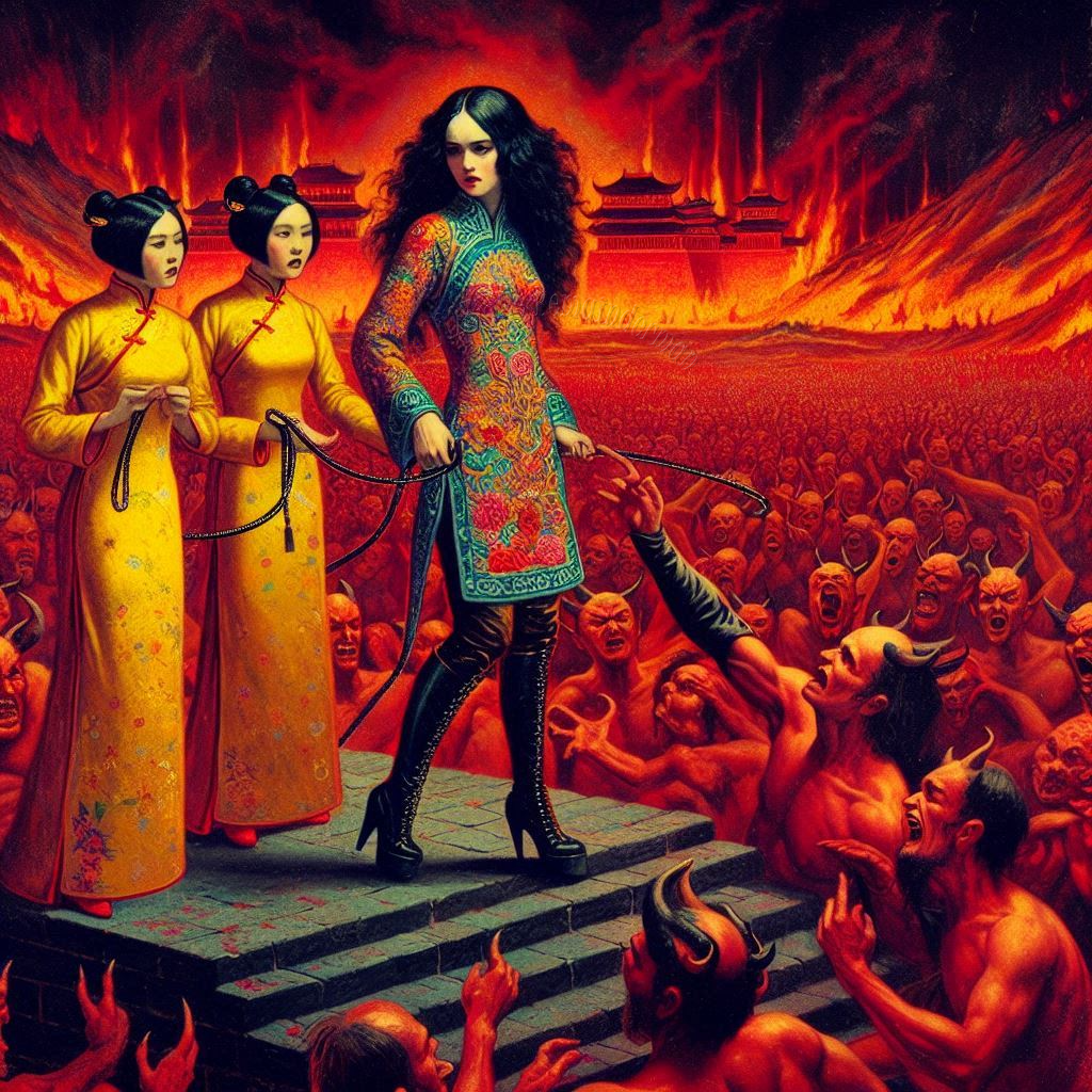Literature Section “06-76 Dance of the Qahramanat XI”Part 76 of Chapter Six, “Le Saccage de la Sale Bête Rouge” (“Rampage of the Dirty Red Beast”)—1212 words—Accompanying Images:  1653-1657—Published 2025-04-28—©2025 The Remainderman.  This is a work of fiction, not a book of suggestions.  It’s filled with fantasies, idiots, and criminals. Don’t believe them or imitate them.