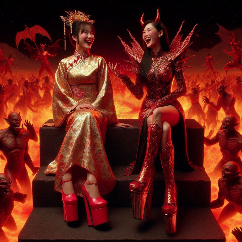 PREVIOUSLY:  Chas is shackled by her ankles with her wrists shackled behind her, blindfolded, and gagged, with her ears plugged.  Esmeray is shackled by the ankles overlooking the sea of devils and demons, restrained from falling down into the chasm they inhabit, only by a waist-high guard rail; while Hong holds her gently from behind, holding hands with her arms around Esmeray.  They are surprised by a new arrival.  NOW: