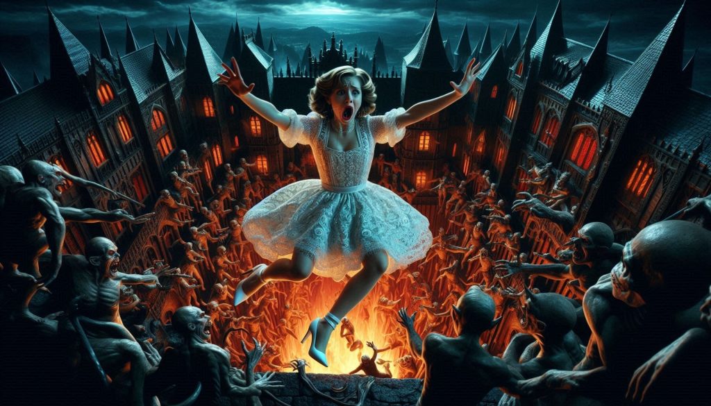 What was happening to her body?!  Inside her own body?!  Her mind knew because it remembered.  When it was aware, it had rarely even realized how thoroughly it knew it was alive every second.  It felt its own breath, felt its own heart, sometimes even heard them or felt the rise and fall of its chest; sometimes smelled and felt the slick moisture of its own sweat.  Now, she could not even tell if her body—if she—was still there, or had ever really been there.  She didn’t know if she had ever even had a body at all.  Perhaps it had all been her imagination.  Or was her body being destroyed, inside and out, continuing the assault every sense she’d had, had been screaming at her to report?  It had to be; her senses were gone, unless reality was actually gone—and she had no way to tell.  Was she even now, falling towards the sea of devils and demons below, who would tear her to pieces for all eternity, over and over again?  Or had she died, and these were the last seconds of her consciousness, mere seconds stretching and lasting in a final desperate effort to cling to life?