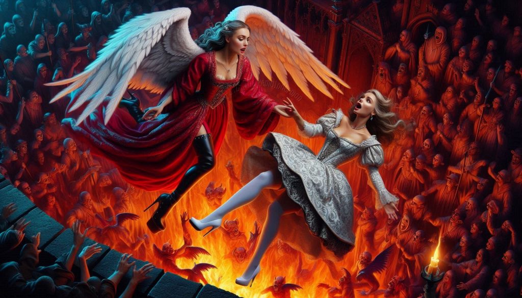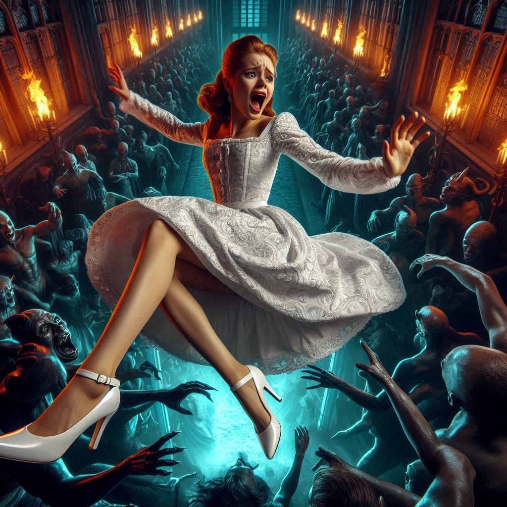 Until a moment later a sharp pull on her ankles stopped her from falling further.  It was so solid, so unyielding, her mind recognized she had not been caught by human—or even demon—hands.  Her bonds must have caught on something!  But that half-thought was about all she had in her and her body was out of control already, her deliberate mind having shut down and ceded control to the basest and most animal instincts, things so deep and distant she could not even recognize them as parts of herself.  Like foundry workers around an exploding furnace they were shouting soundless orders and alarms, flashes of sweaty muscles and hurrying silhouettes and panic-filled eyes rolling in trapped sockets, they made her body jerk and twitch in every direction, trying to free a hand, trying to catch on something else besides her ankles, trying to fall feet-first, trying and failing to do something, that would make a difference long after her will and intentions had shut down and closed their eyes, bracing for impact.